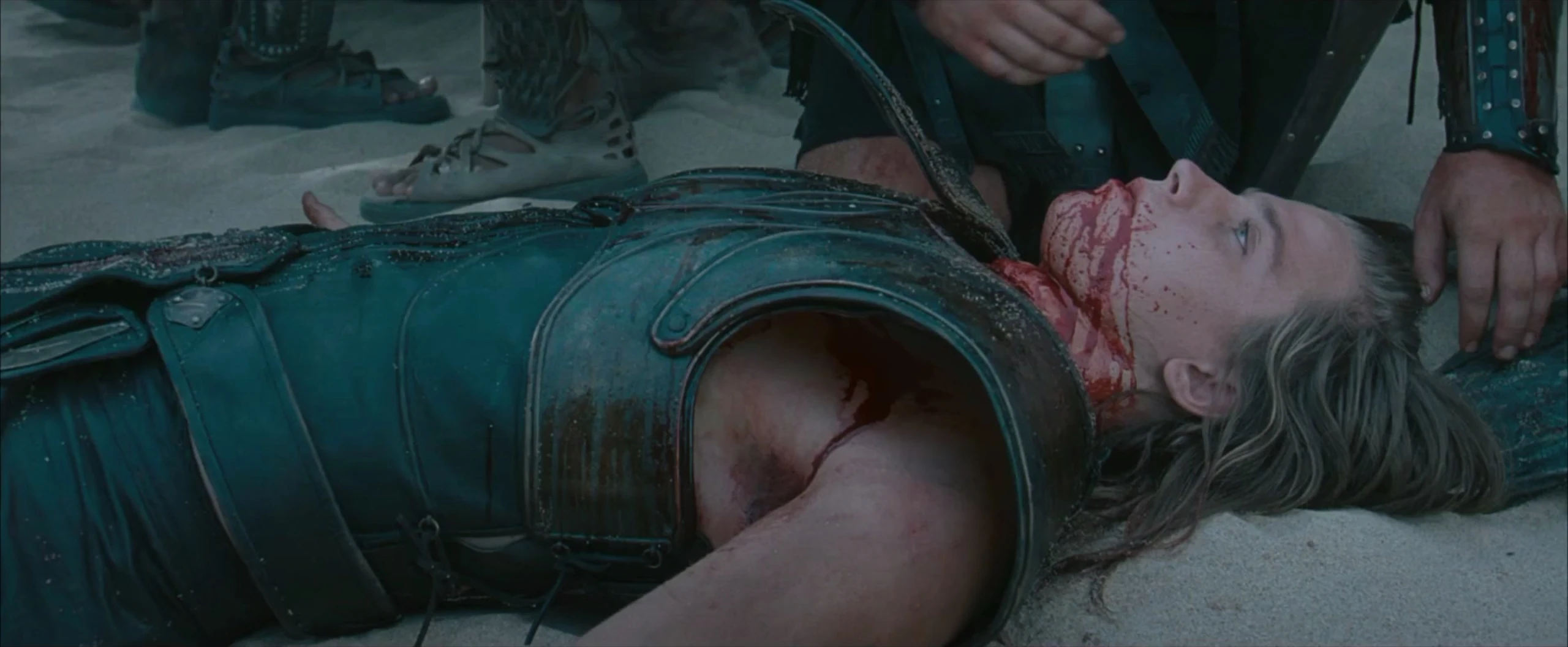 - Troy (2004) [Patroclus]: Throat slashed then stabbed in the chest as a mercy killing by Eric Bana. his body is then burned at night by his cousin Brad Pitt; (Mythologically inaccurate: he was impaled by Hector's spear.)