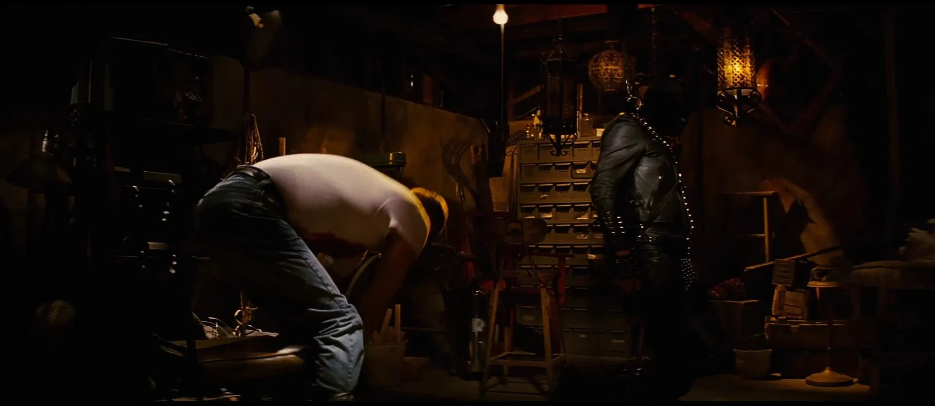 - Pulp Fiction (1994) [The Gimp]: Hanged from the ceiling of Duane Whitaker's basement by Bruce Willis after Willis knocks him unconscious, which leaves him dangling from the ceiling.